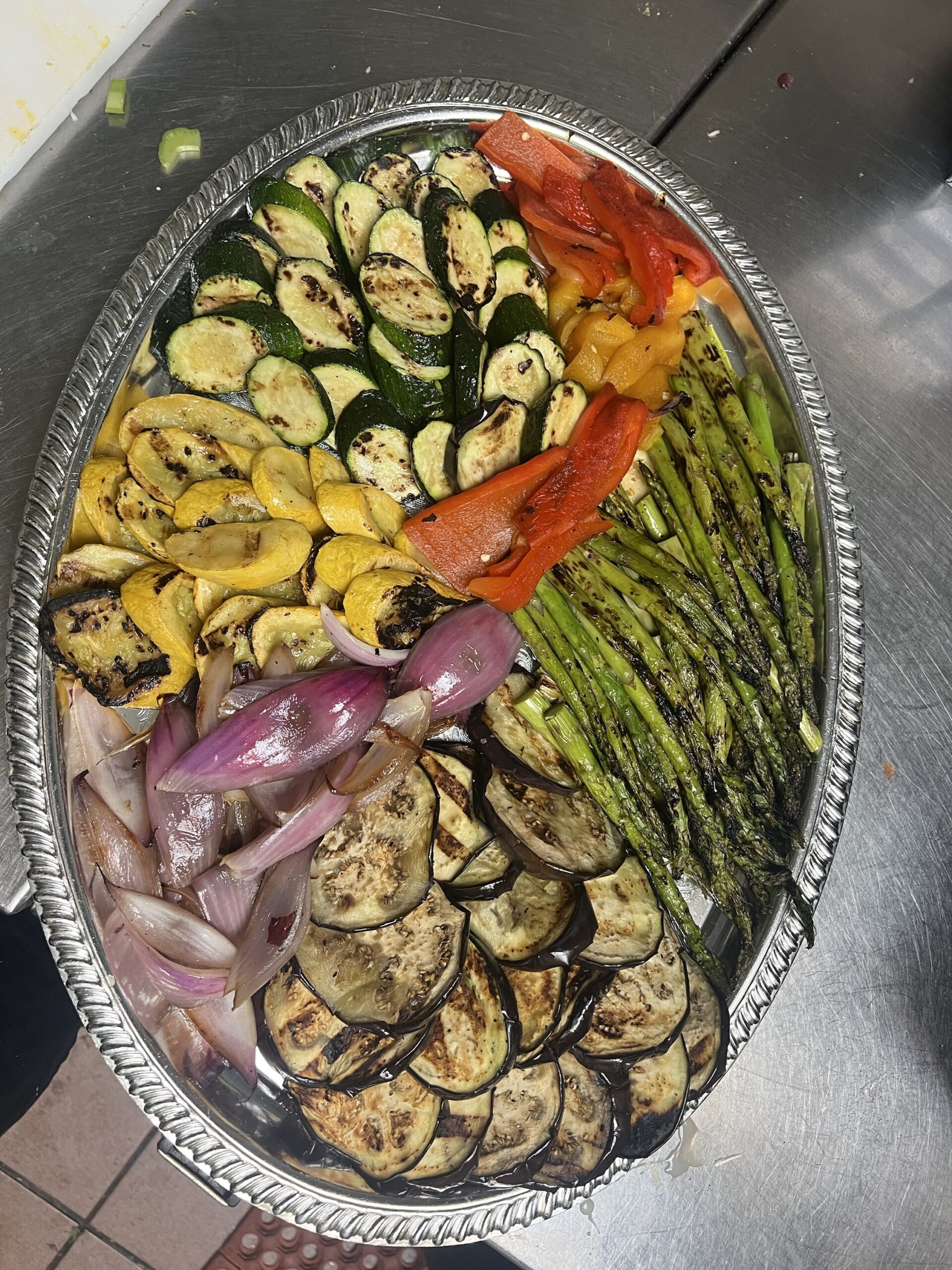 Includes eggplant, yellow zucchini, asparagus, yellow & red peppers, red onions